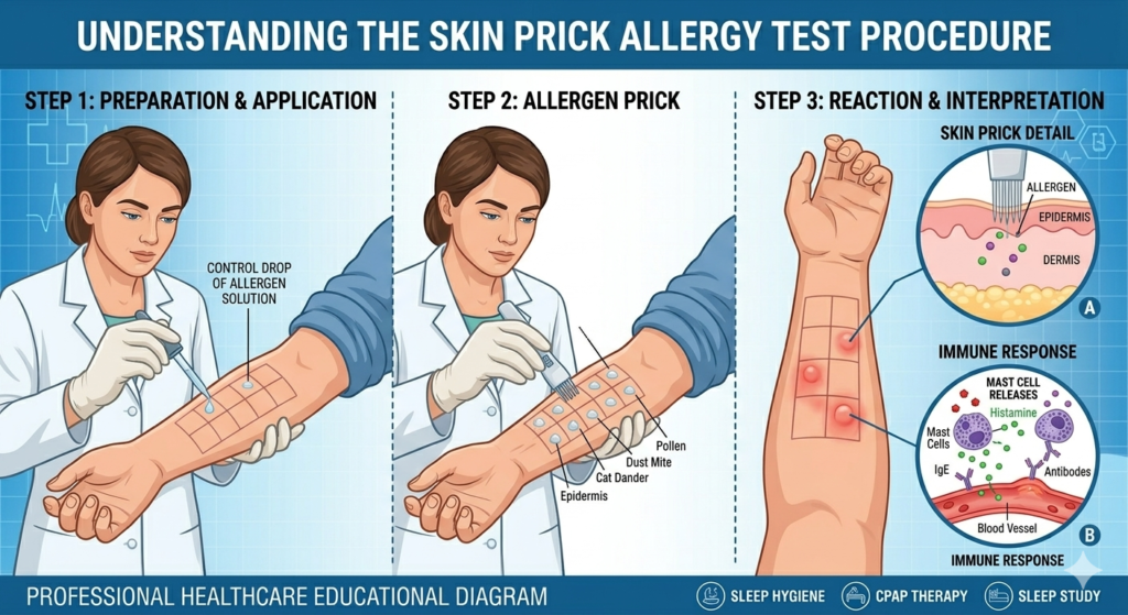 At Dr. Rounak Singhai Chest Clinic, allergy evaluation is performed to identify common triggers responsible for allergic rhinitis, asthma, food allergy, eczema, and insect-related allergies. Among the available methods, Skin Prick Test (SPT) is a safe and effective procedure used to detect sensitivity to multiple allergens.