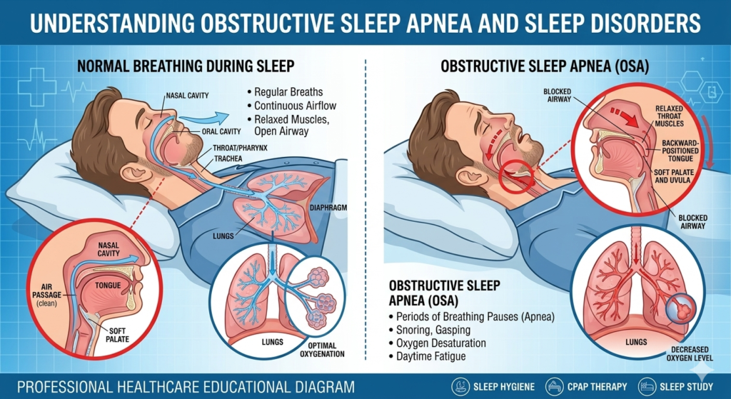 Obstructive Sleep Apnea (OSA) is a common sleep-related breathing disorder in which the airway repeatedly becomes partially or completely blocked during sleep, causing interruptions in normal breathing. These repeated pauses can reduce oxygen supply to the body, disturb sleep quality, and lead to long-term health complications if left untreated.