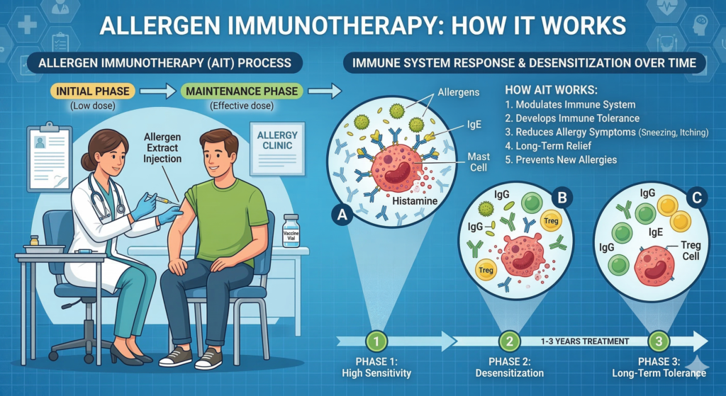 Allergen Immunotherapy is a specialized treatment designed to reduce the body’s sensitivity to specific allergens over time. It works by gradually exposing the immune system to controlled amounts of allergens, helping the body build tolerance and reducing allergic reactions in the long term.