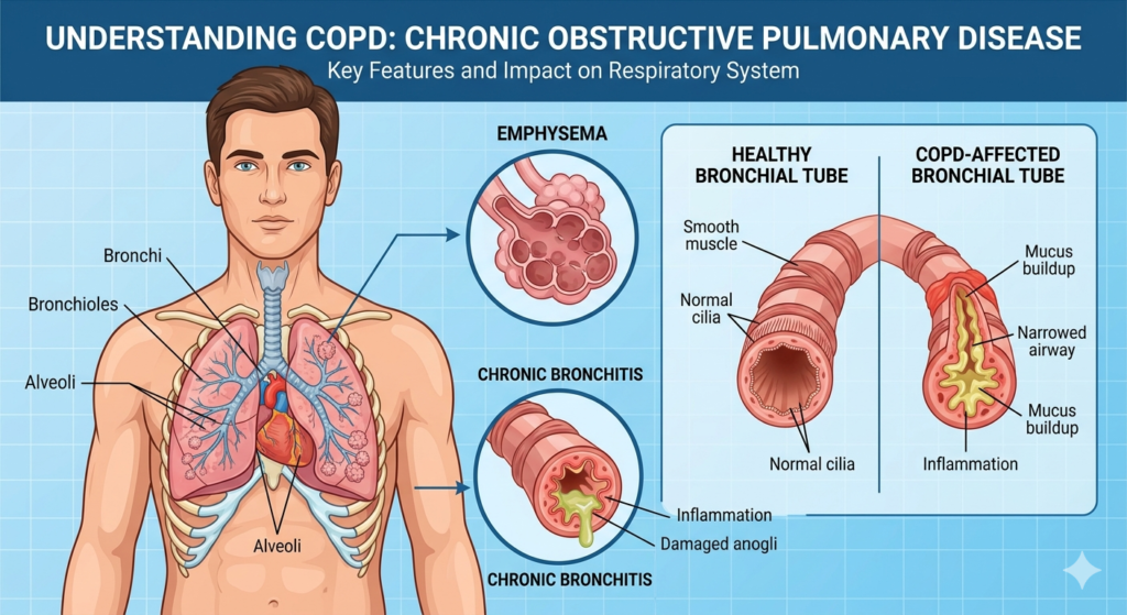 Chronic Obstructive Pulmonary Disease (COPD) is a progressive lung condition that includes emphysema and chronic bronchiectasis, both of which cause persistent airflow limitation and difficulty in breathing. It commonly develops due to long-term exposure to harmful irritants such as cigarette smoke, air pollution, dust, or occupational chemicals.