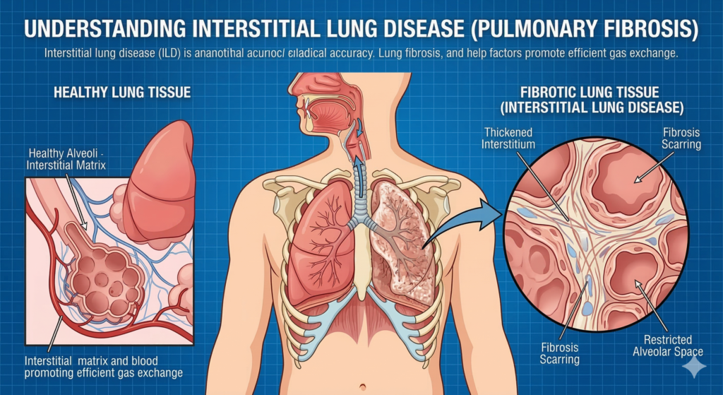 Interstitial Lung Disease (ILD), commonly known as lung fibrosis, refers to a group of lung conditions that cause progressive scarring (fibrosis) of lung tissue. This scarring makes the lungs stiff and reduces their ability to transfer oxygen into the bloodstream, leading to gradual breathing difficulty and reduced lung function.